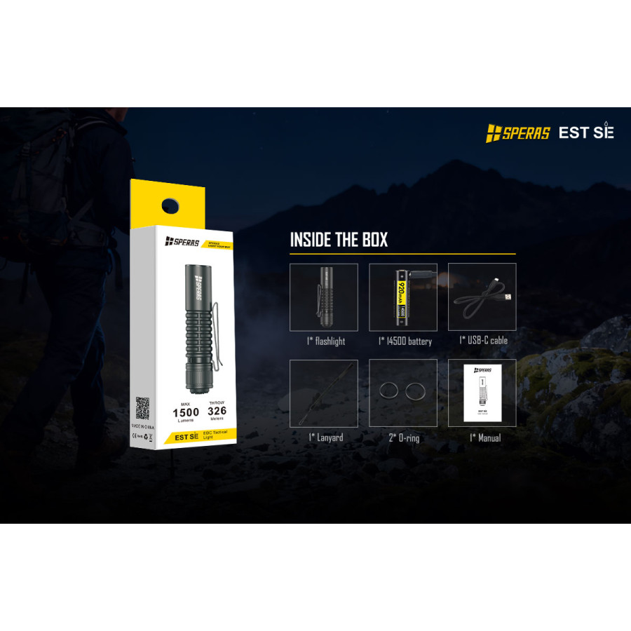 Speras EST SE е компактен и мощен EDC тактически фенер, създаден за ежедневно носене, професионална употреба и ситуации, изискващи бърза реакция. С максимална мощност от 1500 лумена и обхват до около 320 метра, той предлага отлично съотношение между размер и производителност, осигурявайки силна и фокусирана светлина при нужда.
